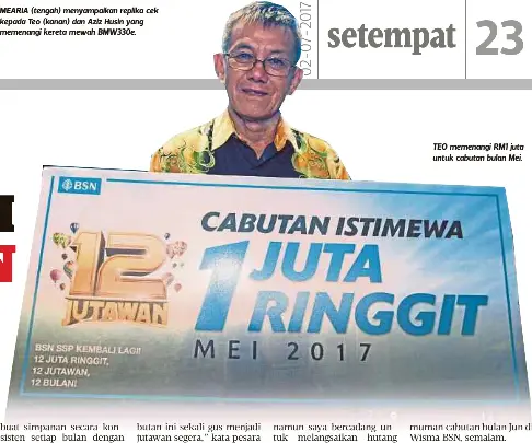 Berbeza dengan simpanan biasa, ssp adalah satu simpanan berbentuk pelaburan patuh syariah yang menawarkan pulangan dividen setiap tahun. Buat kali pertama pada tahun ini, bsn turut mengumumkan seramai 13 orang pemenang bagi. Hadiah utama rm1 juta cabutan istimewa sijil simpanan premium bank simpanan nasional (ssp bsn) bagi oktober 2017 dimenangi tan man hua manakala rozila zainal memenangi cabutan istimewa rm1 juta bagi september. Сальниковая набивка тип bsn2017 (аналог teadit 2017). Kesemua cabutan akan dibuat di auditorium wisma bsn jalan ampang.