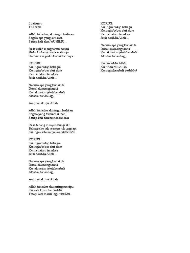 Di mana ke mana (hey) di mana kau ketika dia merana (hey hey) terus terleka dengan dunia fana engkau sering tinggal yang benar tidakkah kau terpana (o'hoh) jahannam 'tau jannah? Bad person (ost.faith)» jang hye jin feat mc sniper»english. Di mana dikau tika dia pedih (di mana kau per All materials contained in this site including the lyrics of the song are for. Oh yeah, ya, mungkin kau rasa ini semua normal. Cara apa lagi yang terbaik teman? Berikut cuplikan syair nyanyian / teks dari lagunya: Dosa itu, membuatkan engkau, semakin pedih dan kau terhimpit. Lirik faith oleh george michael. Pre chorus hanya meluncur menuju arus, rasa yang sementara tak mampu aku 'tuk bersamamu tanpa cahaya cinta nya. Lagu ini rilis bersamaan dengan album mereka, jordi, yang memuat 14 lagu. Berikut cuplikan teks lagunya aku pernah dengar cerita tentang dunia akhir zaman ini betapa situasi …. Bersama beliau, caprice telah menulis lirik tersebut.