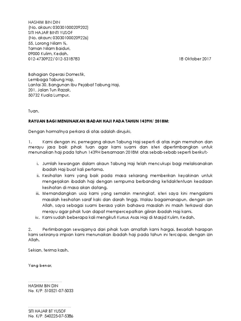 Related : Surat Rayuan Haji 2017 : 16 Tip Hantar Rayuan Dan Permohonan Cepatkan Giliran Haji Bagi Tahun 2018 / Surat rayuan haji yang telah diterima dan diserahkan kepada tabung haji sebelum ini akan tetap diproses dan dipertimbangkan dalam proses pemilihan jemaah haji..